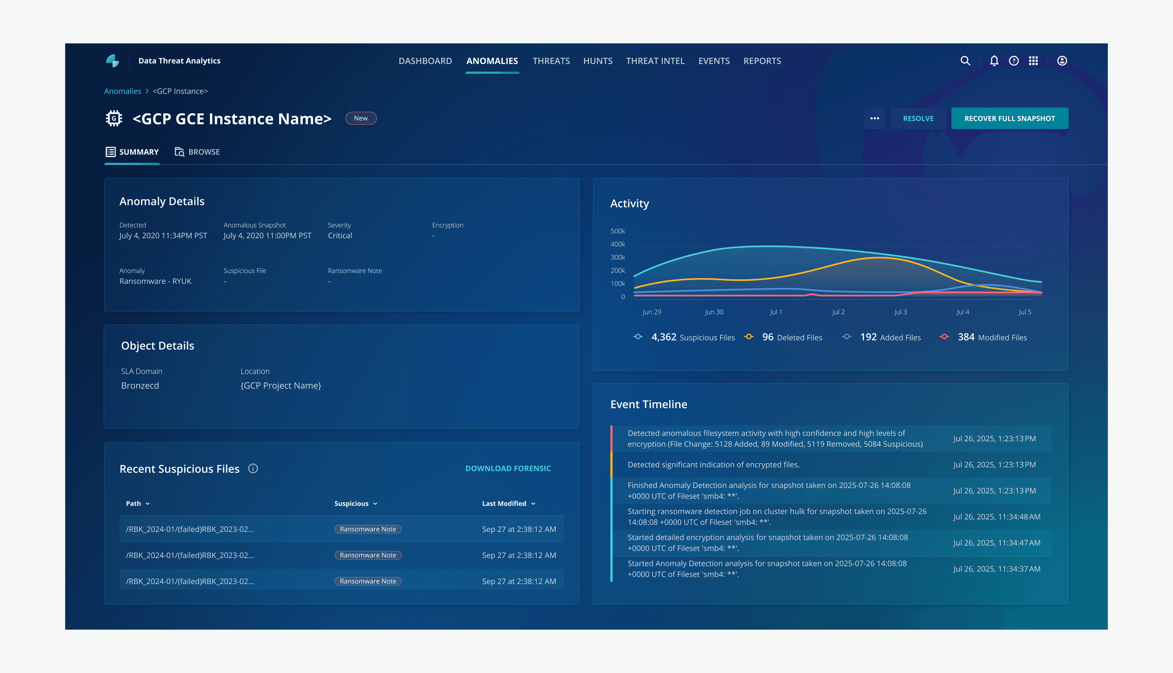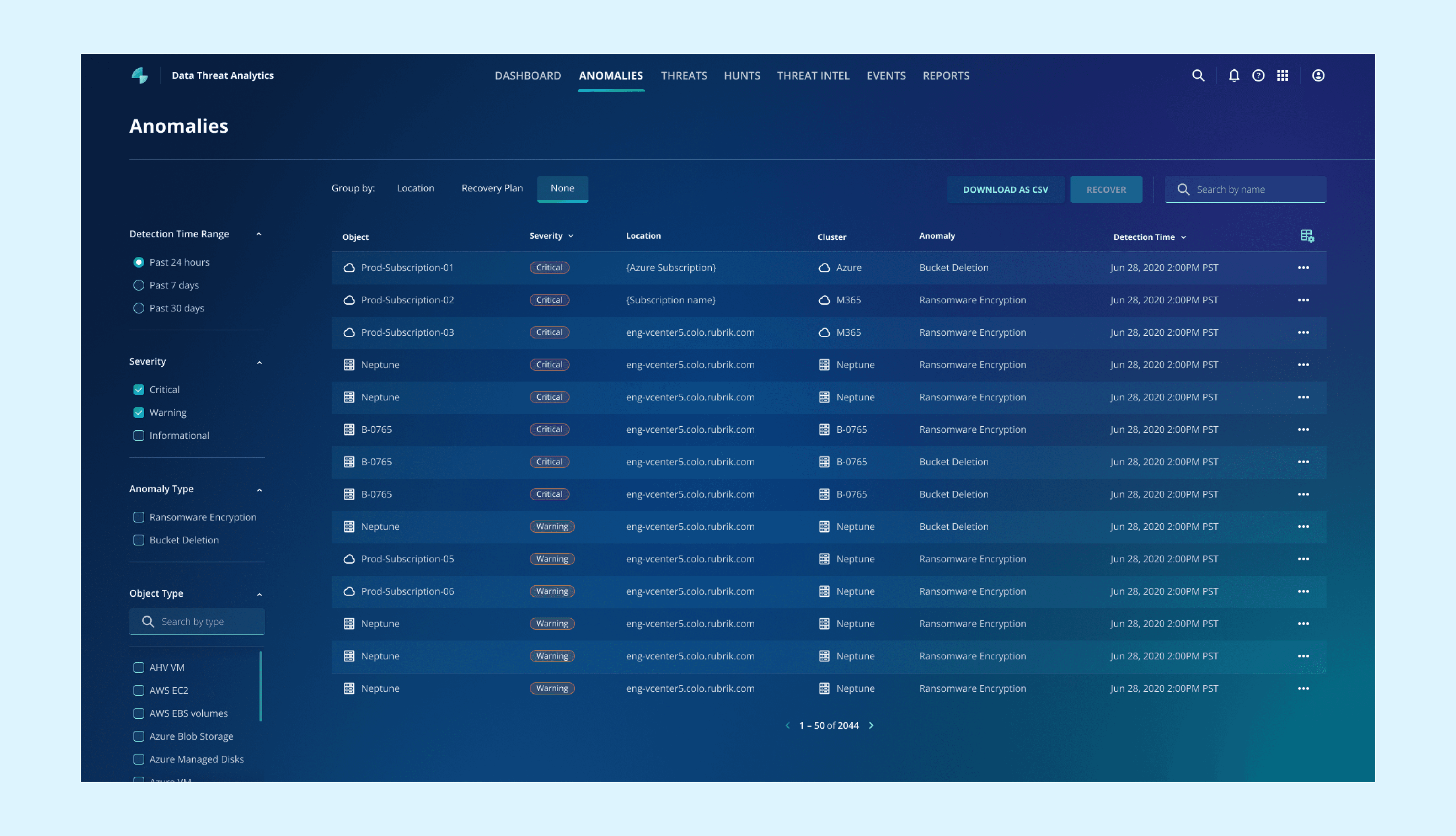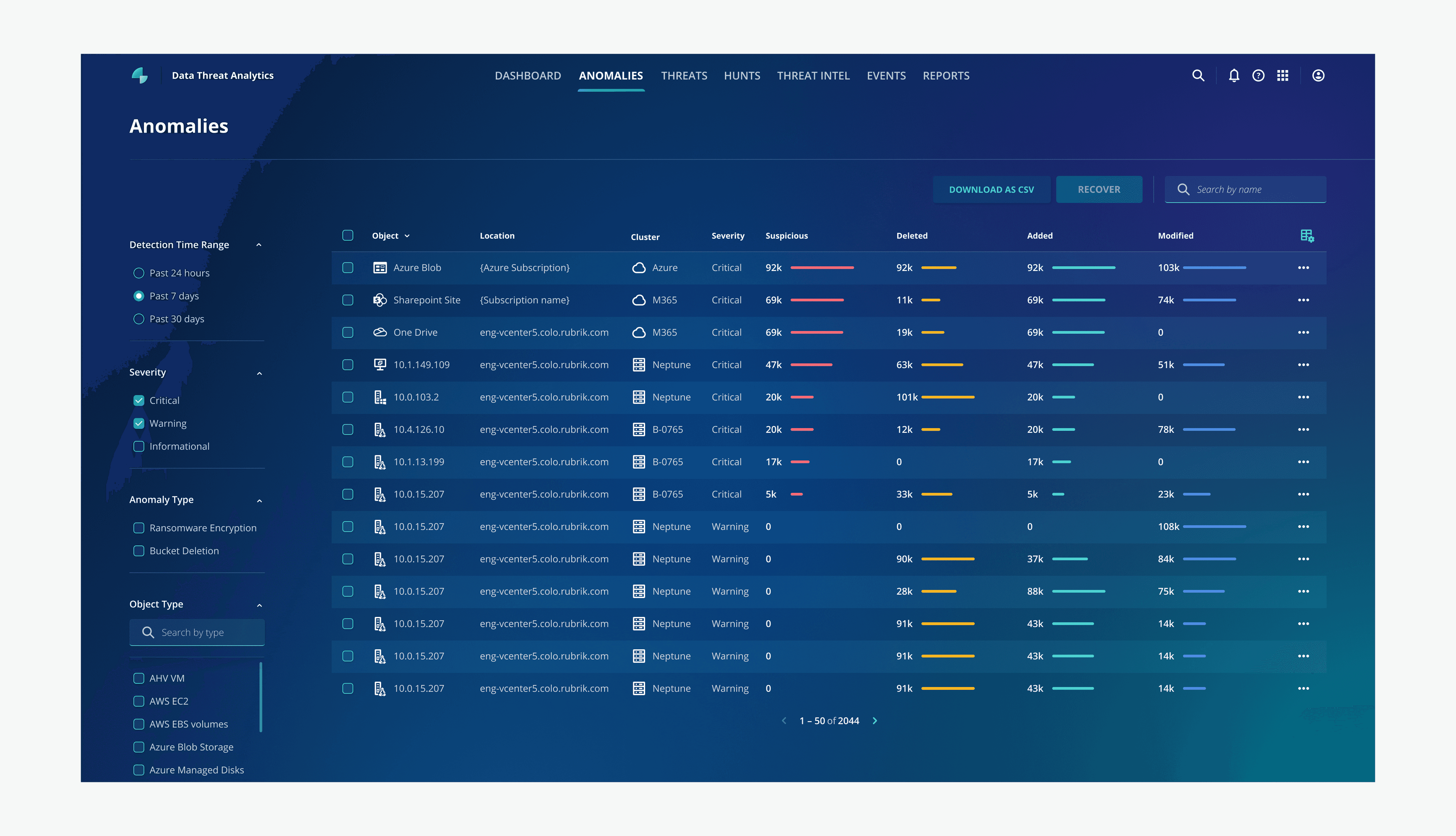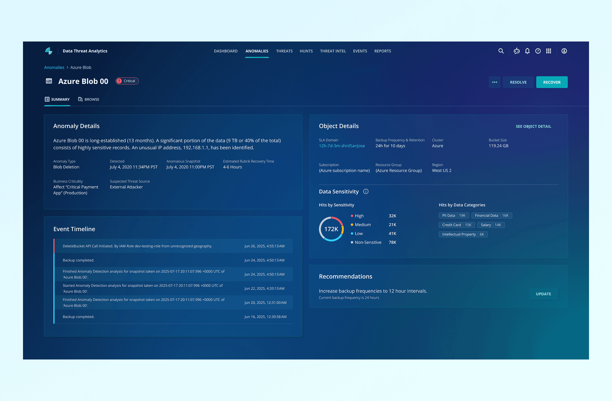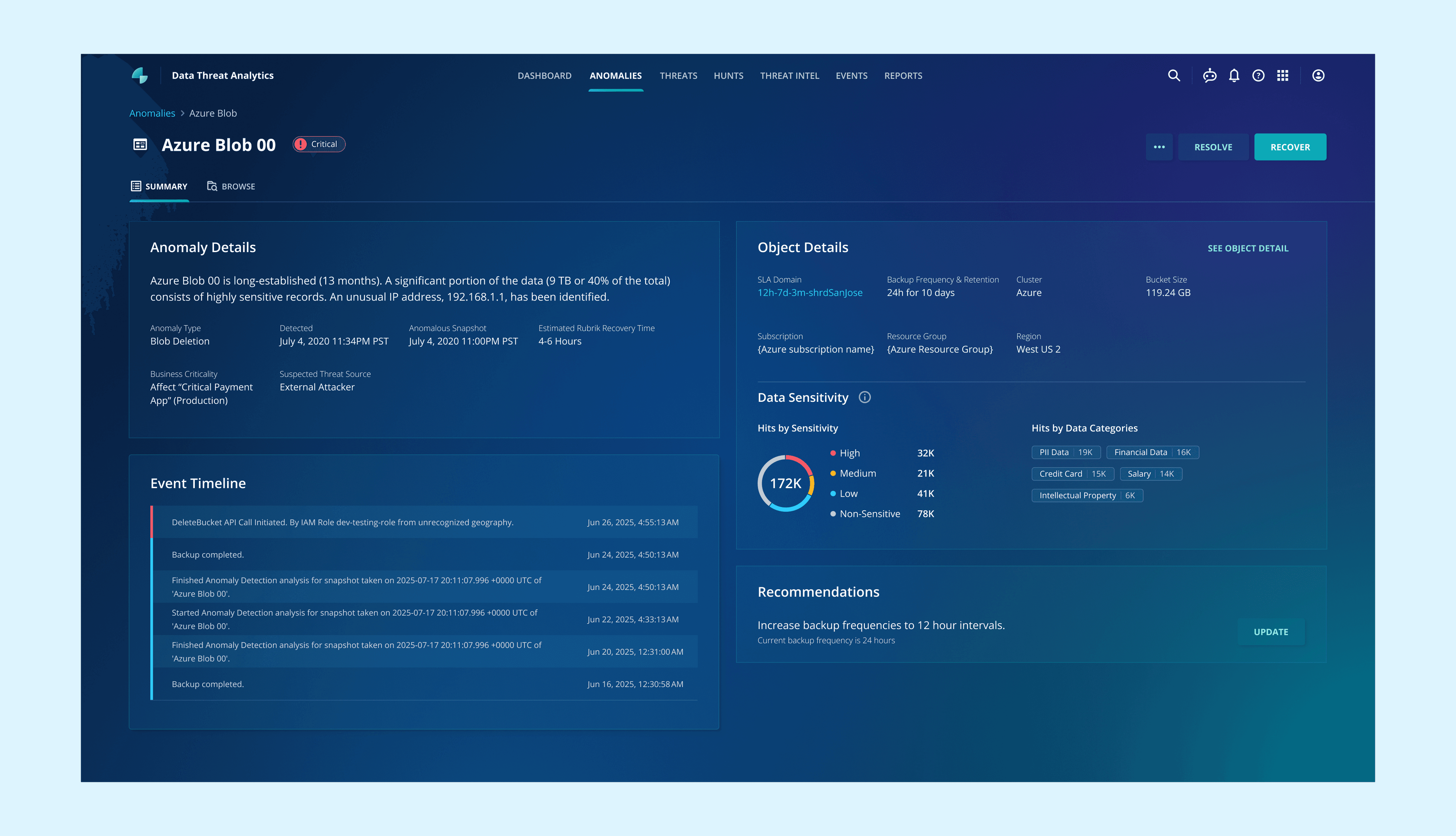 Anomaly detection is a Rubrik's feature under "Data Threat Analytics." It utilizes machine learning to identify unusual activities within an organization's data, such as the encryption of a large number of files. When an anomaly is found, it alerts users, enabling them to respond swiftly to minimize potential risks and data loss.